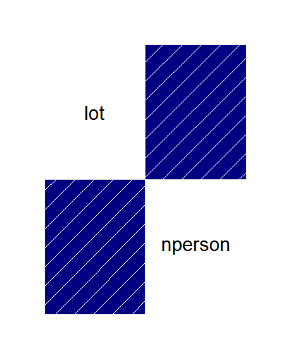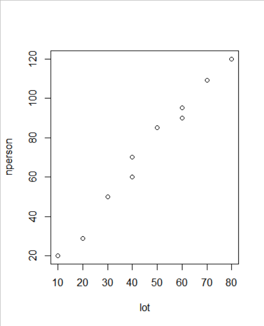 우측에 있는 plot의 결과 우상향의 일직선 모양을 갖고 있으므로 매우 강한 양의 상관관계를 갖고 있으며 lot이 증가할 때 nperson도 같이 증가한다는 것을 알 수 있다.