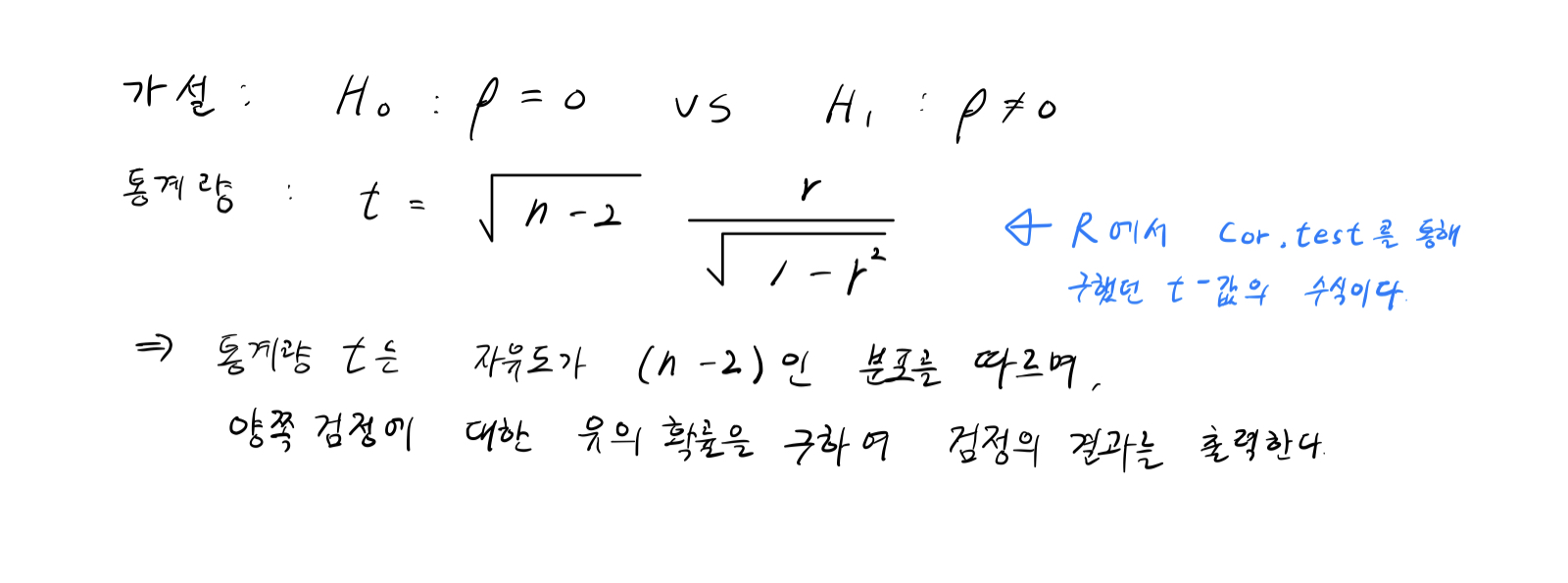 위에 있는 예시에서도 가설검정에 대한 가설을 세웠는데, 보통 상관계수에 대한 가설에 대한 수식 표현은 다음과 같다.