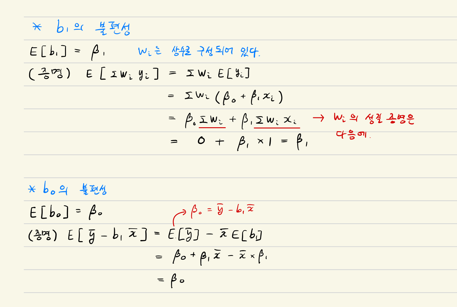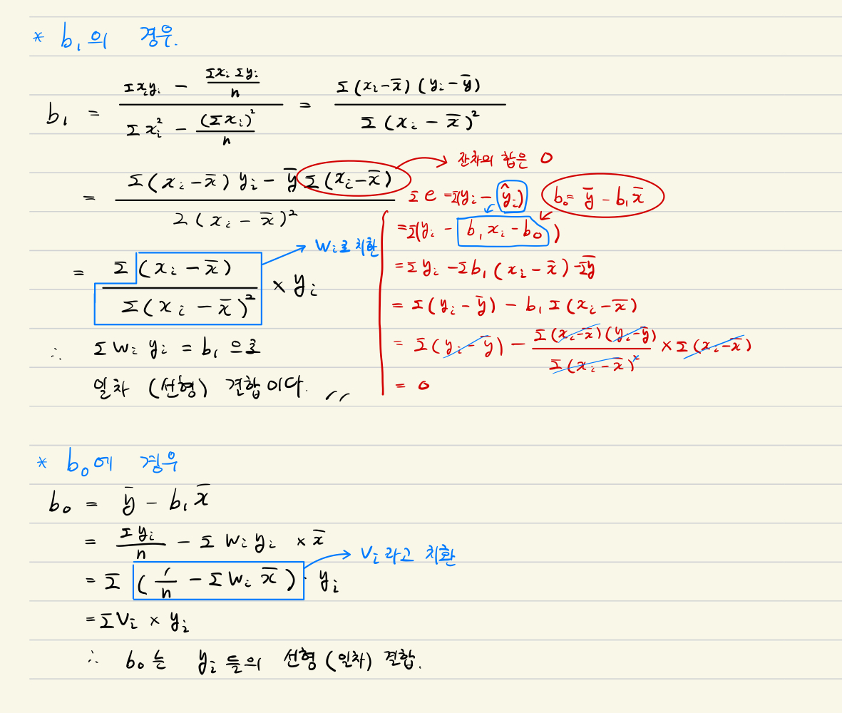 1. b0와 b1은 yi의 선형(일차) 결합이다.