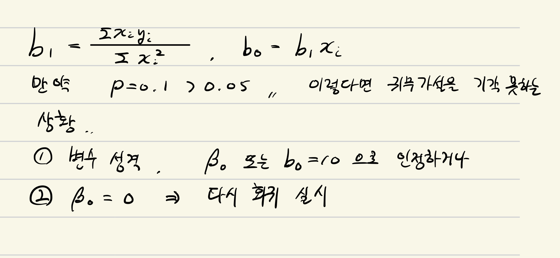 최종적으로 (0, 0)을 지나는 회귀 직선식을 채택한다면 원점을 지나는 회귀를 한다.