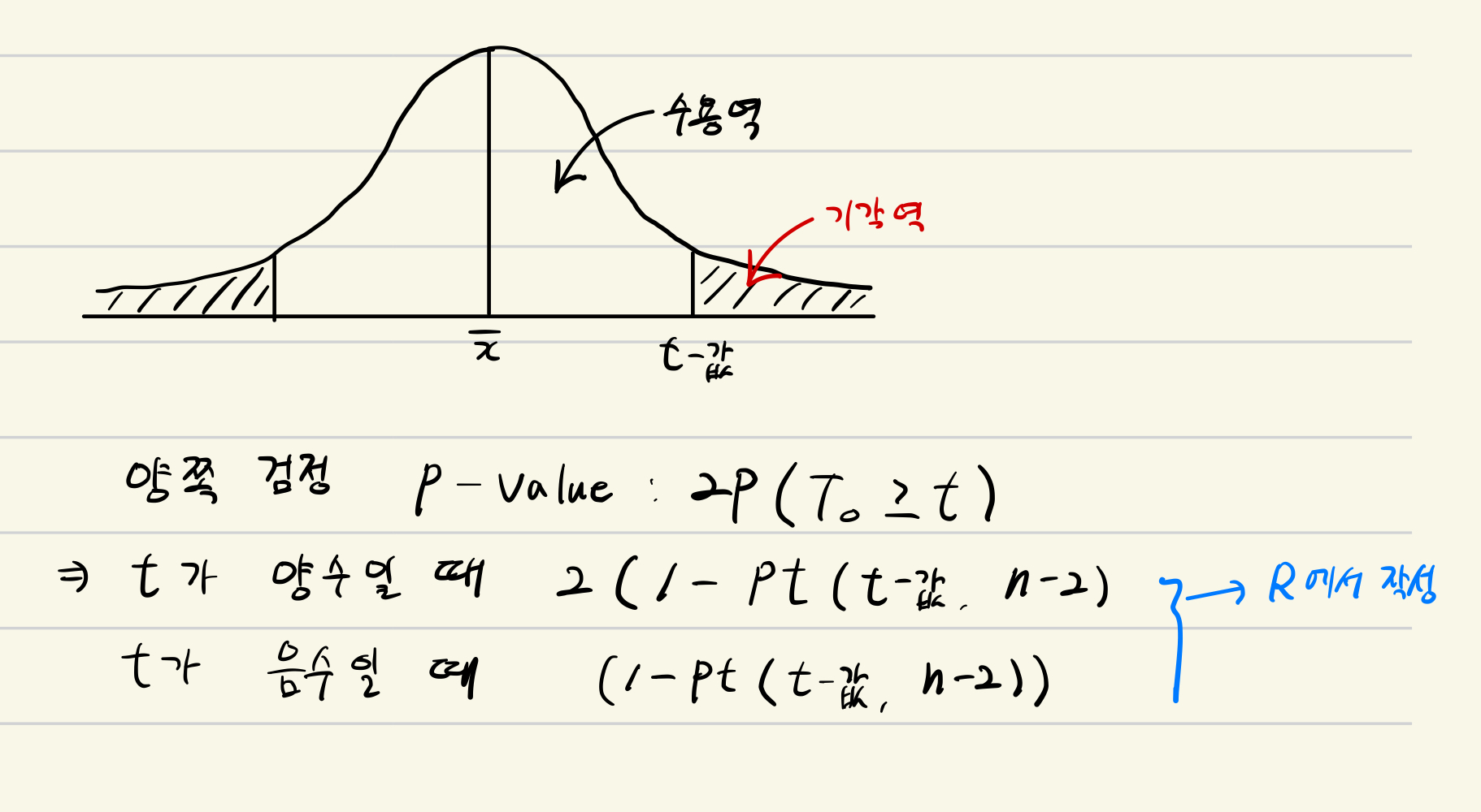 가설 - 귀무가설 : β1 = 0 vs 대립가설 : β1 ≠ 0 (거의 대부분 양쪽 검정을 실시한다.)