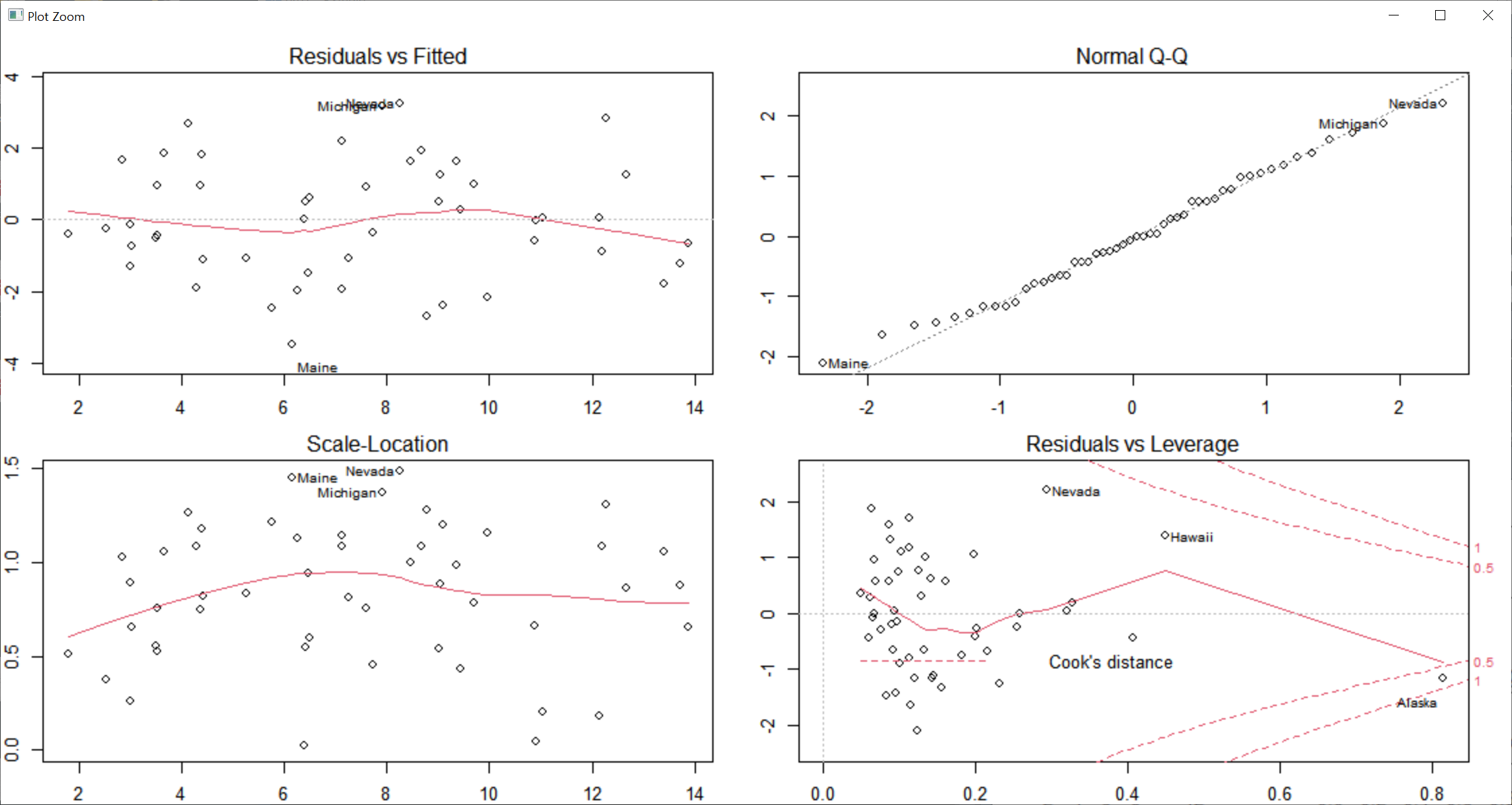 dwtest(Murder ~ ., data = states) # DW = 1.9476, p-value = 0.4208, 독립이다. 자기상관계수는 0이다.