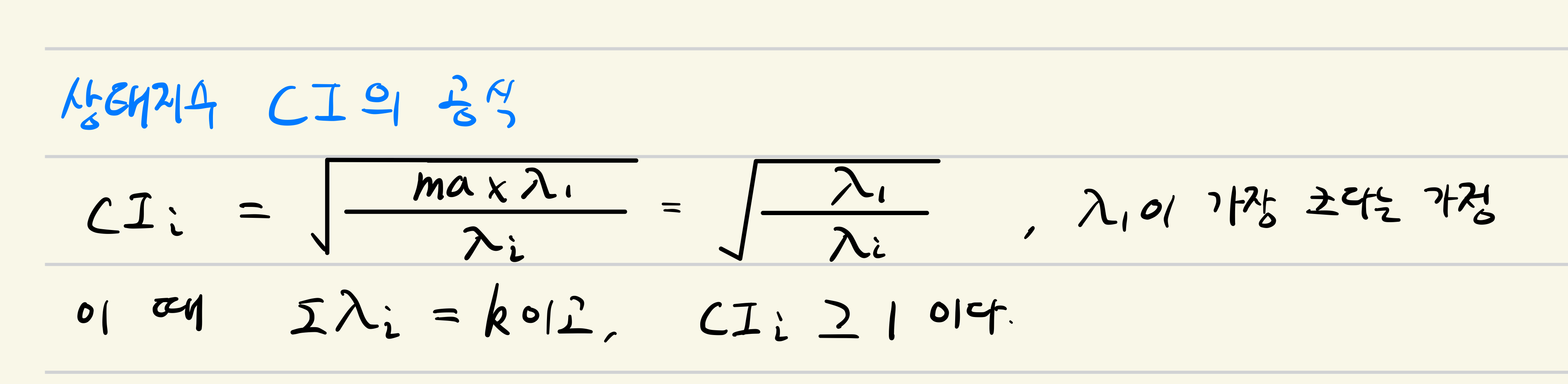 설명변수 사이의 다공선성을 판단하는 지표 중 하나로 상태 지수는 설명변수의 상관 행렬 G의 고윳값을 크기순으로 나타내면 λ1 > λ2 > λ3 >... > λk라고 할 수 있다. 그러면 i번째 설명변수의 상태 지수 CI_i의 식은 다음과 같다.