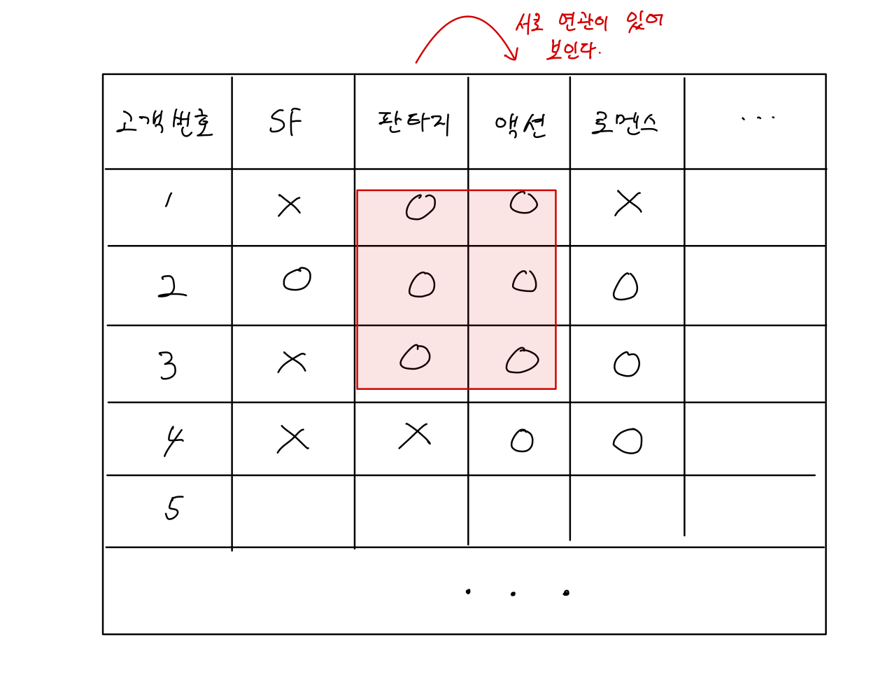 사진을 참고해서 설명을 추가하면 판타지를 보는 고객이 액션도 볼 확률이 높다. 그러므로 판타지 장르와 액션 장르는 연관성이 높다고 볼 수 있다. 그러므로 판타지 장르를 보는 고객에게 액션 장르를 추천하면 매우 높은 확률로 시청하거나 관심을 갖게 될 것이다.