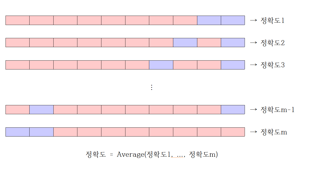 각 데이터에서 도출된 검증 결과들을 평균으로 계산하여 최종 검증 결과를 결정하는 것이 일반적이며, 해당 계산 방법으로 만들어 낼 수 있는 fold의 경우의 수가 커서 계산 시간이 많이 거릴 수 있는 방법이다.